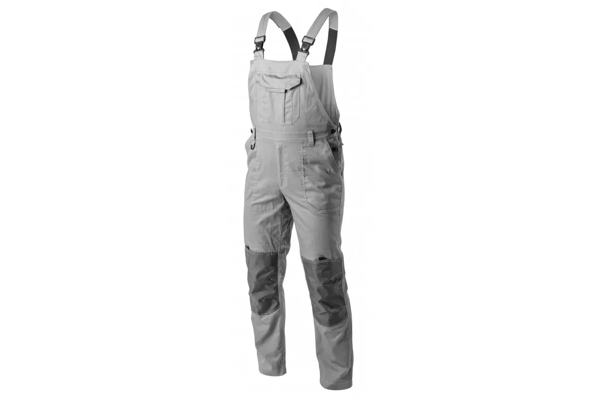 Starannie wykonane męskie ogrodniczki ochronne. Wysokiej jakości materiały i mocny splot zapewniają wytrzymałość i wysoki komfort użytkowania. Tkanina 100% bawełna chroni przed nadmiernym poceniem i dyskomfortem, nie odbarwia się i nie mechaci. Ponadto techniczny krój nie ogranicza ruchów. Zastosowane detale odblaskowe pozwalają zwiększyć bezpieczeństwo pracy po zmroku. Ogrodniczki dostępne są w modnym jasnoszarym kolorze z niebieskimi akcentami i szerokiej gamie rozmiarów (od S do 3XL). Idealne dla pracowników produkcyjnych oraz budowalnych. Polecane również monterom, serwisantom oraz technikom.