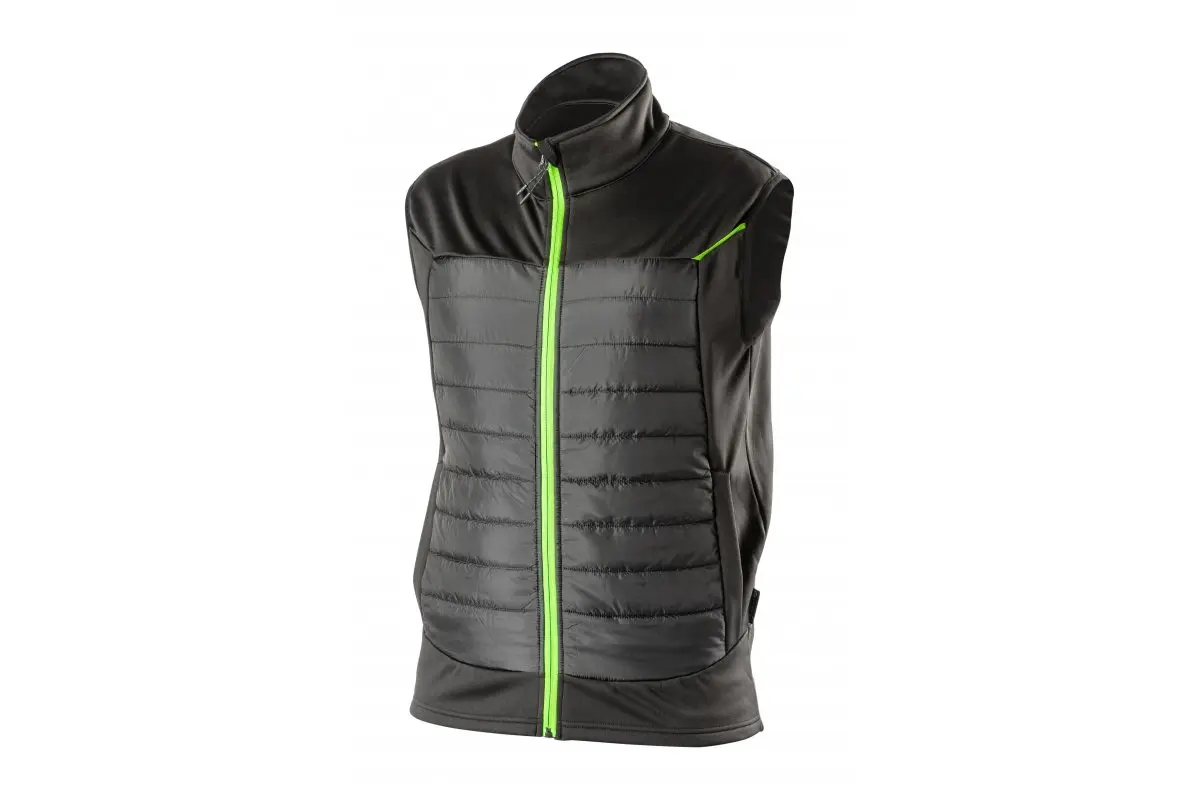 Męska kamizelka hybrydowa przeznaczona dla osób aktywnych fizycznie, operatorów i techników poszukujących całorocznej ochrony bez ograniczenia swobody ruchów. Połączenie pikowanych paneli z elastyczną dzianiną boczną zapewnia lekkość i mobilność, a niska waga i łatwa kompresja czynią ją doskonałą w podróży. Nowoczesna kolorystyka z kontrastowymi zielonymi detalami wyróżnia ten model na tle standardowej odzieży roboczej.